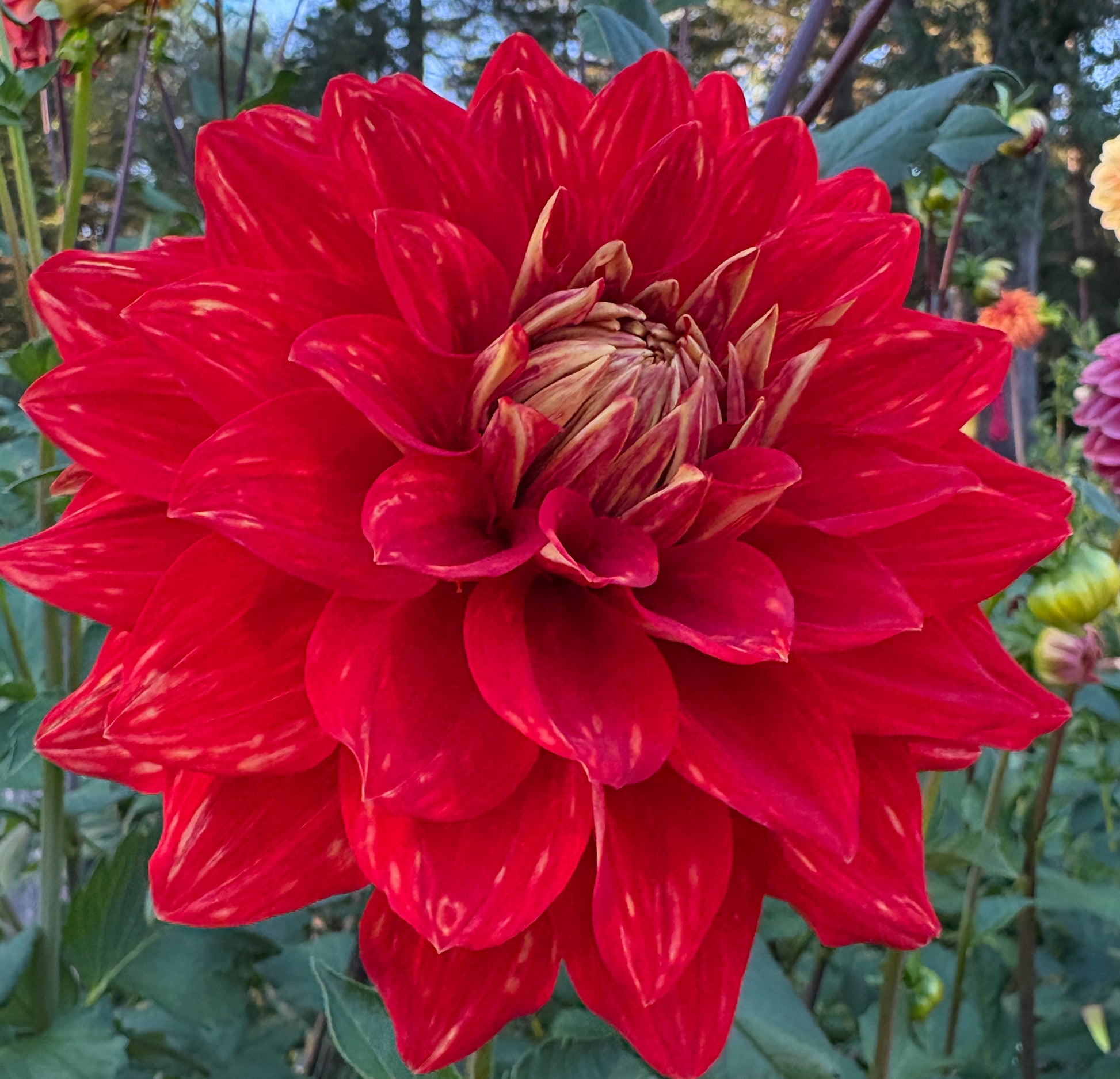 My most vibrant dahlia in my garden. Caliente caught your eye right way. She is the most rich red with the soft golden veining and center. Super prolific in my garden with fantastic stems, she made a great addition as a cut flower.